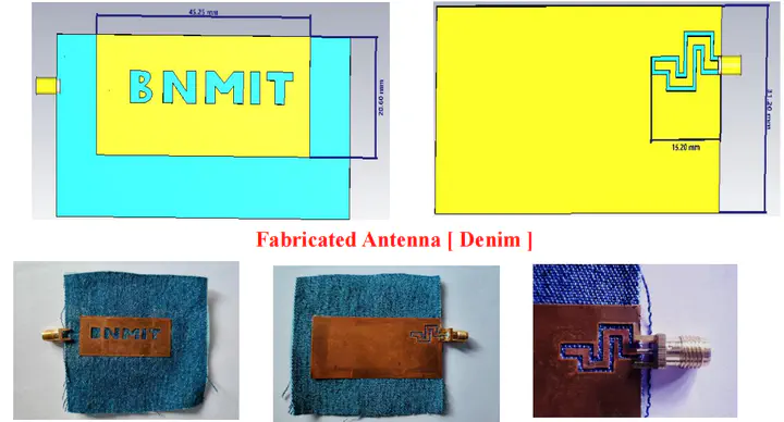 A wearable microstrip patch antenna with operating frequencies of 2.3 GHz (FR4 as substrate) and 2.66 GHz (Denim material as substrate) is designed and tested. Prominent materials considered for substrate parts are Denim fabrics with the relative permittivity €r = 1.67, and the loss tangent tan δ = 0.085 and FR4 (lossy) with the dielectric constant €r = 4.3, and loss tangent tan δ = 0.025 material, while conventional copper metal sheets have been used as antenna conductive material.